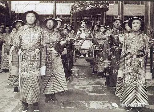慈禧在颐和园仁寿殿前乘舆照。前为总管太监李莲英(右)、崔玉贵(左)
