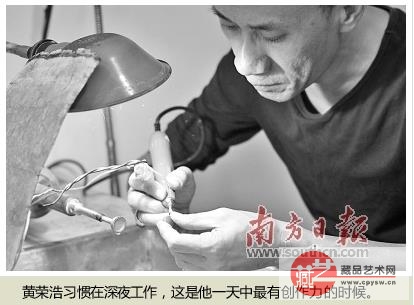 夜晚11时许,伴着玉雕机的“嗞嗞”声,黄荣浩开始了深夜的工作。他伏在工作台前,一手拈着缅甸玉料,一手攥着电刻刀,将自己的设计稿一刀刀雕在玉石上。这是黄荣浩一天中最有创作力的时候。深夜的静谧,总能让他伏案多时不愿起身,因此时常要忙碌至次日3时多才入睡。 黄荣浩是汕头澄海人,20余年来,他的玉雕技艺从熟练到精湛,从学徒成长为广东省、汕头市工艺美术大师。他对玉雕的热爱与坚持始终保持不变:“雕琢玉器如同雕琢人生,都是在‘做减法’,学会适当放下,人生才会过得完满。” 一件又一件栩栩如生的作品背后,是黄荣浩这样的玉雕匠人们精益求精、精雕细刻的坚持和磨砺。如今,他手把手教出的工艺师傅和学徒已有百余人,为潮汕乃至广东培养了一批技艺精湛的玉雕设计及雕刻人才,他们在继续传承黄荣浩的技艺。 而黄荣浩自己,则希望有朝一日能够真正沉下心来,将玉料与艺术完美结合,在快节奏的生活里不紧不慢地雕琢一件真正的艺术品,追逐自己未竟的艺术梦。 结缘玉雕始于一则“小道消息” 家住澄海区隆都镇的黄荣浩现年46岁,从事玉雕行业已有20余年。“我是农村娃。小时每逢放暑假,我就会去打短工。我干过泥工,做过五金、牙签罐推销员,也当过餐饮店杂工。因为较早接触社会,更知道赚钱的不易。”黄荣浩说。 由于年少时家境贫穷,家里人总有这样一种观念——“只要掌握一门手艺,就总不会饿着”。于是,在父母的支持下,黄荣浩随表兄前往广州拜师学习牙雕谋生。仅花了一年多的时间,他就掌握了牙雕的基本功,这为日后在玉雕艺术上的发展奠定了基础。 与玉雕的结缘,始于一位朋友的“小道消息”。据黄荣浩回忆,他还在牙雕厂当学徒工时,有一天,有个朋友来找他,并透露一则“玉雕厂招学徒工”的消息。打听到玉雕厂的招工电话后,黄荣浩偷偷抽空跑去应聘。由于有牙雕的雕刻技艺基础,黄荣浩被优先录取,由此开启玉雕的学徒之路。 “我暗自立誓,无论如何也要把真正的玉雕手艺学到手。”黄荣浩说。 在师傅的耐心指导下,刻苦钻研的黄荣浩不仅很快掌握了玉雕机、玉雕工具的使用方法,还能自己动手雕刻瓜果等简易物品,玉雕技艺突飞猛进。 随后,他转战深圳师从陈升阳。谈起陈升阳,黄荣浩心怀感激地表示,这位师傅带领他走进玉雕世界的深层领域,让他学会雕刻立体甚至镂空的工艺品,实现了从“见全牛”到“见筋骨”的质的飞跃。 2005年,学成出道的黄荣浩回到老家汕头,开办了自己的玉雕工场。从一开始的买玉加工到成立玉雕工作室,黄荣浩逐步走上独立创作、产业化经营的道路。 看材料品相用“减法”雕琢 那么,从事玉雕行业究竟需要怎样的品质?“如果没有深厚的功底和丰富的雕刻经验,就很难驾驭手中那一块光滑细腻、价值不菲的美玉。”采访间隙,黄荣浩一边喝着工夫茶一边缓缓地说道。 在他看来,深厚的功底和丰富的雕刻经验来自于夜以继日的刻苦努力,绝无捷径可言。“如果从业者会画画或者设计,从事玉雕工作会更有感觉。当然还必须具备耐心、细心、热情三大素质,浮躁的人是做不长久的。”黄荣浩称。 他还说,想要雕刻好的作品,除了要有高超的技艺,还要有好的灵感,做到一气呵成。他用行内话告诉记者,玉雕要看材料的品相行事,是用“减法”雕琢技艺来表现。 这种理念充分体现在他的玉雕作品《福乐园》创作过程中。“《福乐园》算是我比较满意的作品。这块翡翠玉胚之前在家里放了好几年,我也多次进行设计,总觉得难以下手。”他指出,《福乐园》反映了孩子们在幸福乐园里无忧无虑生活玩耍的画面,仔细观赏会发现孩子们一种灵动的活泼气息。 “难以下手”,对他而言是灵感不够。有一次,他参观完潮州木雕“龙虾蟹篓”之后,灵光乍现,当即决定参考潮汕木雕镂空通雕的手法雕琢这块红翡翠,还要特别凸显出红翡翠里面的蓝地,使其表现力更为丰富。这件作品后来获得2014年第十届国际文博会广东省工艺美术大师精品展中国工艺美术文化创意奖金奖。 令黄荣浩念念不忘的还有另外一件已经售出的作品《五福临门》。原来,在雕琢这件作品的过程中,黄荣浩融圆雕、浮雕、镂空雕等多种技艺为一体,层次分明,让大块空间和细腻刻画相得益彰,从局部到整体均统一于圆润的基调中,玉料的天然美与作品的工艺美一览无遗。 倾囊相授培养众多传承人 历经20多年的玉雕设计制作和不断的学习进取,黄荣浩凭借自身厚实的文化底蕴,巧妙融合圆雕、浮雕、阴雕、镂空雕等多种技法,并在继承传统工艺的基础上进行创新,形成了自己独特的设计风格。 然而,近年来,玉雕市场上开始出现电脑雕刻,甚至呈现普及的趋势,这让黄荣浩忧虑不已,“虽说这是科技发展的必然结果,但这已经对玉雕传统手艺产生严重冲击。” 不仅如此,由于当今翡翠矿产几近枯竭,翡翠原石价格水涨船高,特别是高质量的翡翠原石更是越来越稀少,对玉雕师傅的雕刻技艺提出了更高要求,如今,越来越多年轻人不愿意学习这门手艺。黄荣浩担心,不久的将来,这门手艺可能面临失传。 对此,他似乎有先见之明。从开办工场到创立工作室,在技能传承和培养人才方面,黄荣浩总是毫无保留地将自己的精湛技艺和丰富的设计雕刻知识传授给其他师傅和学徒。在他的领头传艺下,培养了一批技艺精湛的玉雕设计及雕刻人才,他们
