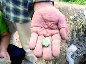 一名“淘宝者”在挖坑铲土,不远处还有人支起遮阳伞。 废厂变宝地 举家齐挖玉 玉器厂荒地遍布挖采坑存隐患 专家称玉石大多太小没价值 近日有市民爆料,昌平未来科技城附近一片荒地成了“宝地”,有人抡铁锹挖坑捡拾玉石碎料。记者从小汤山镇土沟村了解到,该处原为一玉石雕刻厂, 已关闭多年,剩余废料便堆积在此。记者随后将当时捡拾到的几颗“宝贝”给一业内人士看,经辨认,“大多数都太小做不出东西来,没有什么价值”。 现场 众人挖宝忙 拎水又带饭 近日,北京晨报记者跟随“淘宝者”找到这片位于未来科技城北侧的荒地,周围人烟稀少,走近才发现杂草丛中其实“潜伏”着许多人,都在弯腰低头挖宝,挥着铁锹忙得不亦乐乎。 放眼看去,不到两百平方米的荒地上分散着20来个“淘宝者”,他们多结伴而来,一人挖坑铲土,一人从土里寻石,甚至带着饭、拎着水,还支起遮阳伞。一对夫妻指着脸盆大小一块玉石笑着说,“这是我们一大早挖到的,最近几天收获不少。” 记者注意到,大多数袋子装的都是“碎石”,有被打磨或者摔裂的痕迹,鲜有拳头大小以上、成色透亮有光泽的石块。 市民展示挖到的绿松石。 讲述 售卖没市场 只为图个乐 现场一女子告诉记者,她已经在此“挖宝”两年多,“前几个月挖到一块大的,我给自己弄了对儿玉镯子,光加工费就花了500多块钱,不过人们都说那块玉成色好,值了。”现在成色普通、大小一般的玉石、玛瑙、水晶她已经看不上,“我就挖松石,那东西值钱”。 旁边另一女子也说,“听说有一男的挖到很大一颗绿松石,卖了2万块,发财全凭运气”,但她坦言自己至今挖到的东西还没卖出去过。现场一老汉拿着一塑料袋的玉石碎料叫价2000元,无人问津,他直接降价到200元,最终也没出手。 多数挖宝者则称,来挖宝不为卖钱,只是图个新鲜。一位提了两布袋碎玉石的男子称,捡回去是为铺鱼缸下面做装饰,“虽然这玩意儿不值钱,但要真想买还不容易买到。” 一对夫妻挖出脸盆大小一块玉石。 探访 曾是玉器厂 荒废二十年 荒地为何出现如此大量玉石碎料?附近村民透露,此处以前有一个玉石雕刻厂,“下脚料就扔了呗”。记者随后从昌平区小汤山镇土沟村村委会王主任处 印证了上述说法,“之前那儿确实是一个玉器厂,大约在上世纪九十年代初关了。后来村里拆迁,那片地就成了荒地,大约从去年开始发现有人到那儿去挖玉石 了。” 王主任介绍,这片荒地归属权还在村里,租给未来科技城使用,尚未开发。“挖石头并不涉及盗取或破坏文物,因此我们也不会明令禁止,只是担心挖坑太深有安全隐患,多次派工作人员到周边警示提醒。” 记者随后将当时捡拾到的几颗“宝贝”给一位做玉石生意的业内人士看,经辨认,其中有和田玉、秀玉、玛瑙、翡翠、水晶、绿松石等多种碎料,“大多数都太小做不出东西来,没有什么价值。”