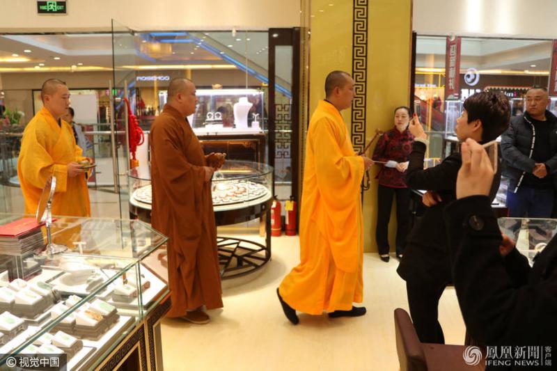 2017年1月2日报道,1月1日,湖北宜昌市一家玉器店新年伊始,邀请浙江乐清造化寺主持释圣清法师来店为顾客“平安祈福”玉器开光。来源:视觉中国