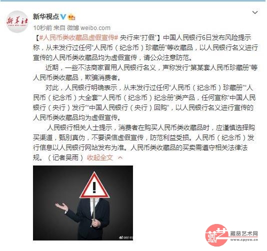 【#人民币类收藏品虚假宣传# 央行来“打假”】中国人民银行6日发布风险提示称,从未发行过任何“人民币(纪念币)珍藏册”等收藏品,以人民银行名义进行宣传的人民币类收藏品均为虚假宣传,请公众注意防范。 近期,一些不法商家冒用人民银行名义,声称发行“第某套人民币珍藏册”等人民币类收藏品,欺骗消费者。 对此,人民银行明确表示,从未发行过任何“人民币(纪念币)珍藏册”“人民币(纪念币)大全套”“人民币(纪念币)纪念册”类产品,任何宣称“中国人民银行(央行)发行”“中国人民银行(央行)回购”,以人民银行名义进行宣传的人民币类收藏品均为虚假宣传。 人民银行相关人士提示,消费者在购买人民币类收藏品时,应谨慎选择购买渠道,甄别真伪,不要误信虚假宣传,防范利益受损。人民币(纪念币)发行信息以人民银行网站发布为准。人民币类收藏品的买卖需遵守相关法律法规。(记者吴雨)