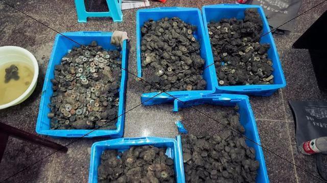 相关工作人员把这些古钱币装入5个整理箱中,因为年代已经久远,每个古币上的表层都有厚实的黏土紧紧贴在上面。300多斤重的古钱币,工作人员预计大概能有2万多枚。