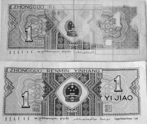 而济南市民王女士展示的两张一角纸币显示,背面国徽位置较正常纸币的色泽要浅,右下角两处本来该有的文字标示均变成了空白。本来该有的‘YI JIAO’字样,在这张纸币上也不见了踪影。“这两张纸币是连号的,钱币出错的位置也都是一样的。”王女士说。