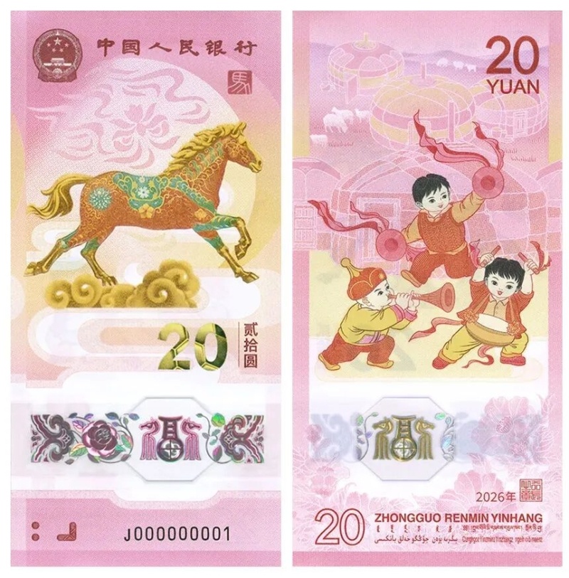 2026年纪念钞面额20元,采用塑料材质,正面主图案为马的造型、篆书“马”字印章、数字“20”与汉字“贰拾圆”,背面主图案为儿童欢庆锣鼓图案,辅以蒙古包装饰图案。