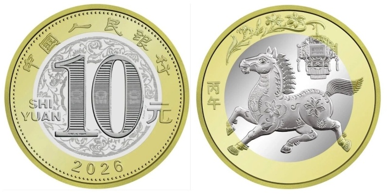 2026年贺岁普通纪念币面额10元,材质为双色铜合金,正面图案主要为“中国人民银行”“10元”字样,底纹衬以团花图案;背面图案为中国传统剪纸艺术与装饰年画元素相结合的马形象及“丙午”字样,衬以花灯和萱草图案。