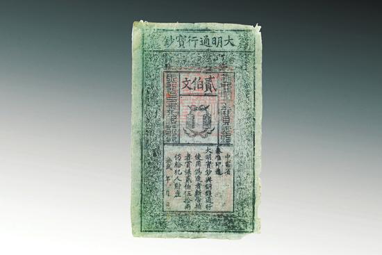 长27厘米,宽16.5厘米。宝钞采用桑皮纤维做钞料,钞纸纤维细长,深蓝灰色。宝钞正面有龙纹边框,边框上的横额为“大明通行宝钞”六字。边框内上层两侧分别为叠文篆书“大明宝钞”和“天下通行”共八字。中间横书钞文“贰佰文”。钞额下面绘钱串图,一串象征一百文。边框内下层楷书“中书省奉准印造大明宝钞,与铜钱通行使用。伪造者斩,告捕者赏银贰佰五拾两,仍给犯人财产。洪武 年 月 日”。文字上盖篆书“宝钞提举司印”朱文印一方。背面上层加盖篆书“印造宝钞局”朱文印,背面下层有龙纹边框,框内横书钞额和钱串图。史载,明洪武八年(1375年)“诏中书省造大明宝钞”,洪武十三年(1380年)废中书省,印钞改属户部。中书省发行宝钞仅5年,传世稀少。 张磊