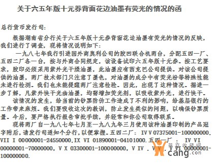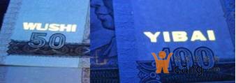 (1)最早正式公布防伪荧光的品种:90版100圆券和50圆券