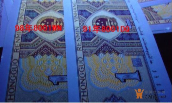 90版100圆券(简称90100,其他币以此类推)、9050以及961每张纸币的荧光都相同,收藏的价值不大,早期荧光试验币,只有在部分冠号、部分流水中存在的,才有较大的收藏价值,主要集中在8001、8005、801、902等品种上。