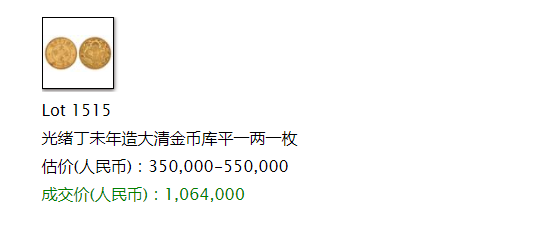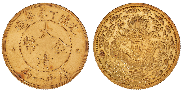光绪丁未年造大清金币库平一两样币一枚,清光绪三十三年(1907年)户部天津造币厂试铸,纯金铸造,齿边,重量:37.7克,光绪三十一年,清政府颁布“整顿圜法酌定章程”,规定“所造三品之币,即文曰大清金币、大清银币、大清铜币,通行天下,以归一律。”大清金币后因金本位制未立而未发行,铸额极少,光泽完美,品相极佳。