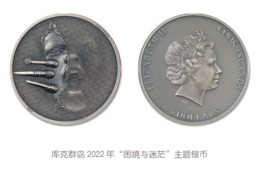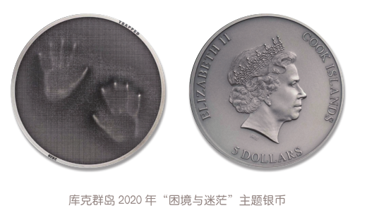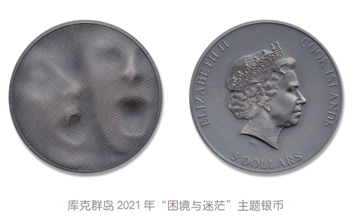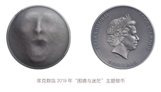 2019年,库克群岛首发“困境与迷茫”主题银币,该币正面图案采用阴影化、磨砂化、抽象化、浮雕化的风格,绘出了一个痛苦狰狞的面孔,只见币中人物正张着嘴,发出撕心裂肺的惨叫声,这声音中似乎充满了不甘与绝望。没人知道他遭遇过什么,正在经受什么,未来又将如何。