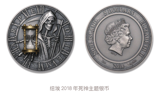 在一些国家发行的死神形象钱币中,还会夹杂一些其他配件以丰富主题,如在纽埃发行的相关钱币上,镶嵌有金属沙漏,死神手捧沙漏,意指光阴易逝,生命短暂。在帕劳发行的相关钱币上,死神手握命运之棋,似乎要操控一切。