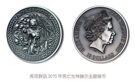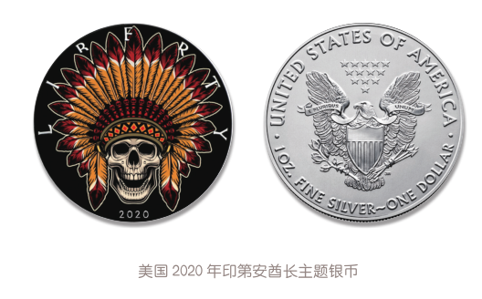 一般来说,死亡主题钱币上大多带有骷髅元素,如美国于2020年发行的印第安酋长主题银币。此外,这类钱币也常出现有骷髅形象的死神图案。如库克群岛于2015年发行的死亡女神赫尔主题银币中赫尔的形象即为“半人半尸”,这种左右强烈的反差给人以极大的视觉冲击。