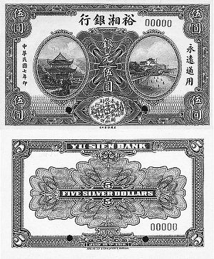 事实上,湖南银行在清末至解放初期的几十年间曾发生过数次重要的转变。1912年(民国元年),湖南都督谭延闿将清末“湖南官钱局”改组为湖南银行,系湖南设立银行名称之始。在1918年倒闭后,湖南省紧接着就成立了裕湘银行,并发行新币铜圆和银元数种来兑换旧币。裕湘银行纸币是湖南督军张敬尧驻军湖南时所发行的。当时,湖南是南北战争的主战场,为维持战争消费,利用官僚资本创办裕湘银行,滥发纸币,吸纳现金。裕湘银行纸币在湖南最不受欢迎,只好强行利用发放军饷、教育拨款等搭配发放。该银行只维持了两年零一个月,于1920年随着张敬尧被驱逐出湖南而倒闭。