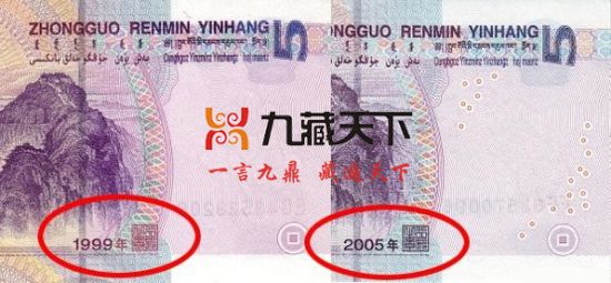 第二、99年版5元券背面的年号第一次使用了“彩虹印刷”技术