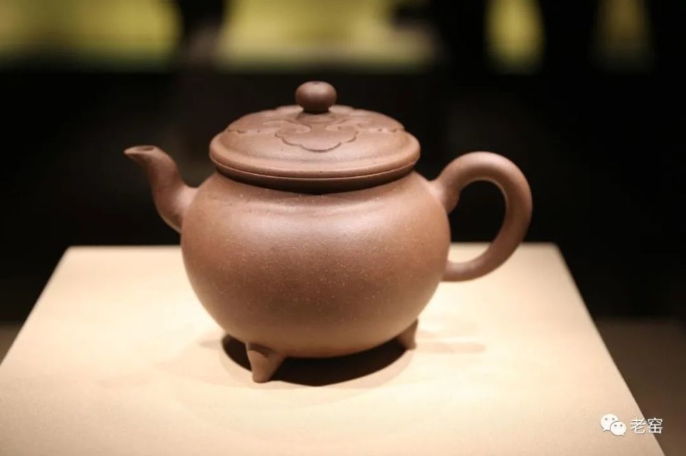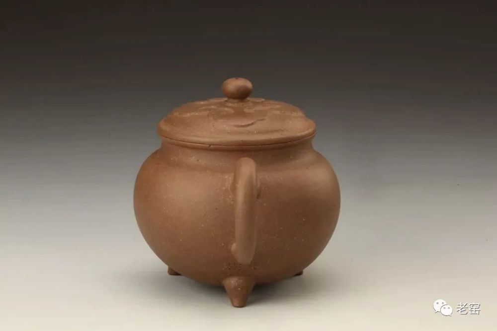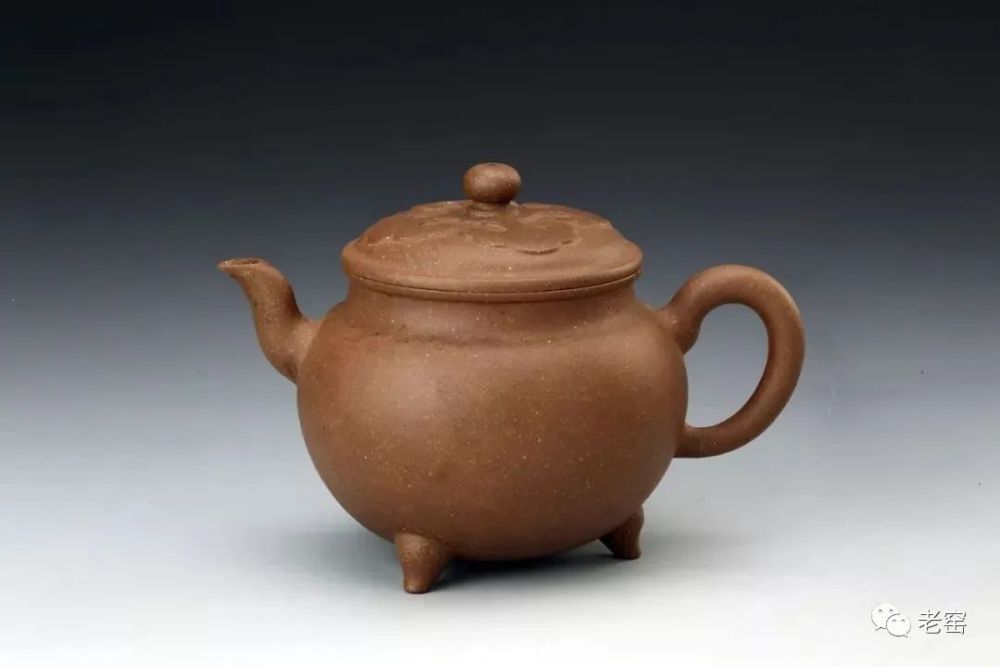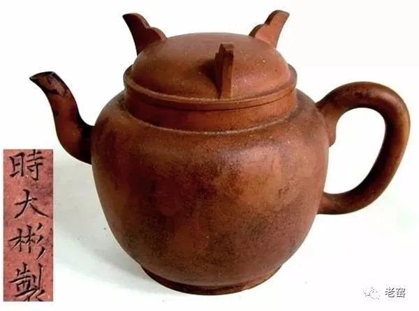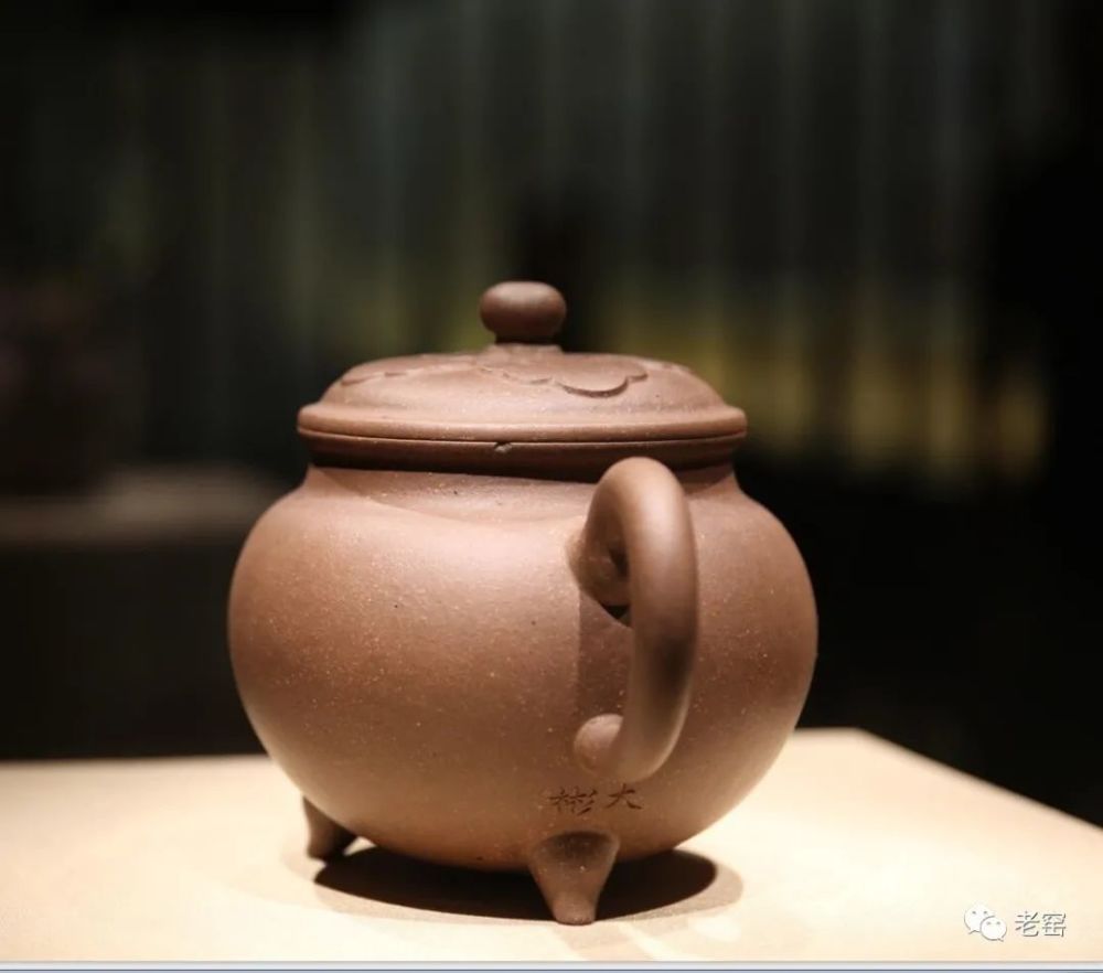 壶以粗砂制成,呈猪肝色;壶形浑圆,下承三乳钉足。盖面堆饰四瓣柿蒂纹泥片,寓意“事事如意”;把稍下阴刻“大彬”二字楷书。此壶是公认的“大彬壶”精品。
