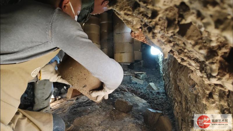“开窑咯!”“开窑大吉!”当天下午2时,卓易文创负责人周群与窑工们共同挥锤,将龙窑身侧其中一个封住的窑门击破。