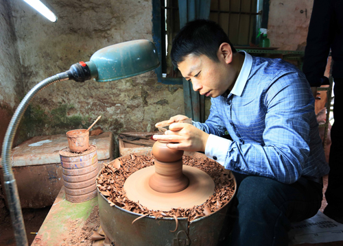 11月20日,在茶培村廖氏陶艺制作坊,廖军自我介绍说,2008年至2011年他在江苏宜兴学徒打工,制作紫砂壶。后来得知家乡景德镇也发现巨大的紫砂宝库,经过了解论证,他于2012年回到家乡创业,用当地紫砂生产紫砂壶,一炮打响。如今,他的作坊每月生产紫砂壶2000把,销往广东、宜兴等地,年收入60-70万元。