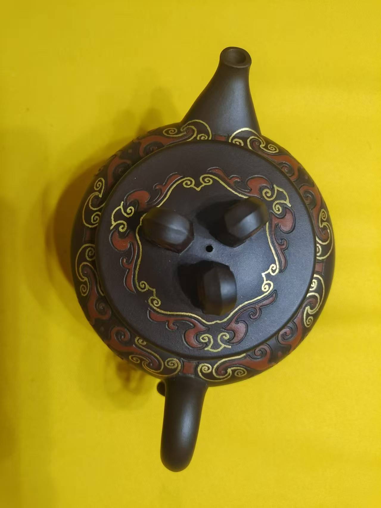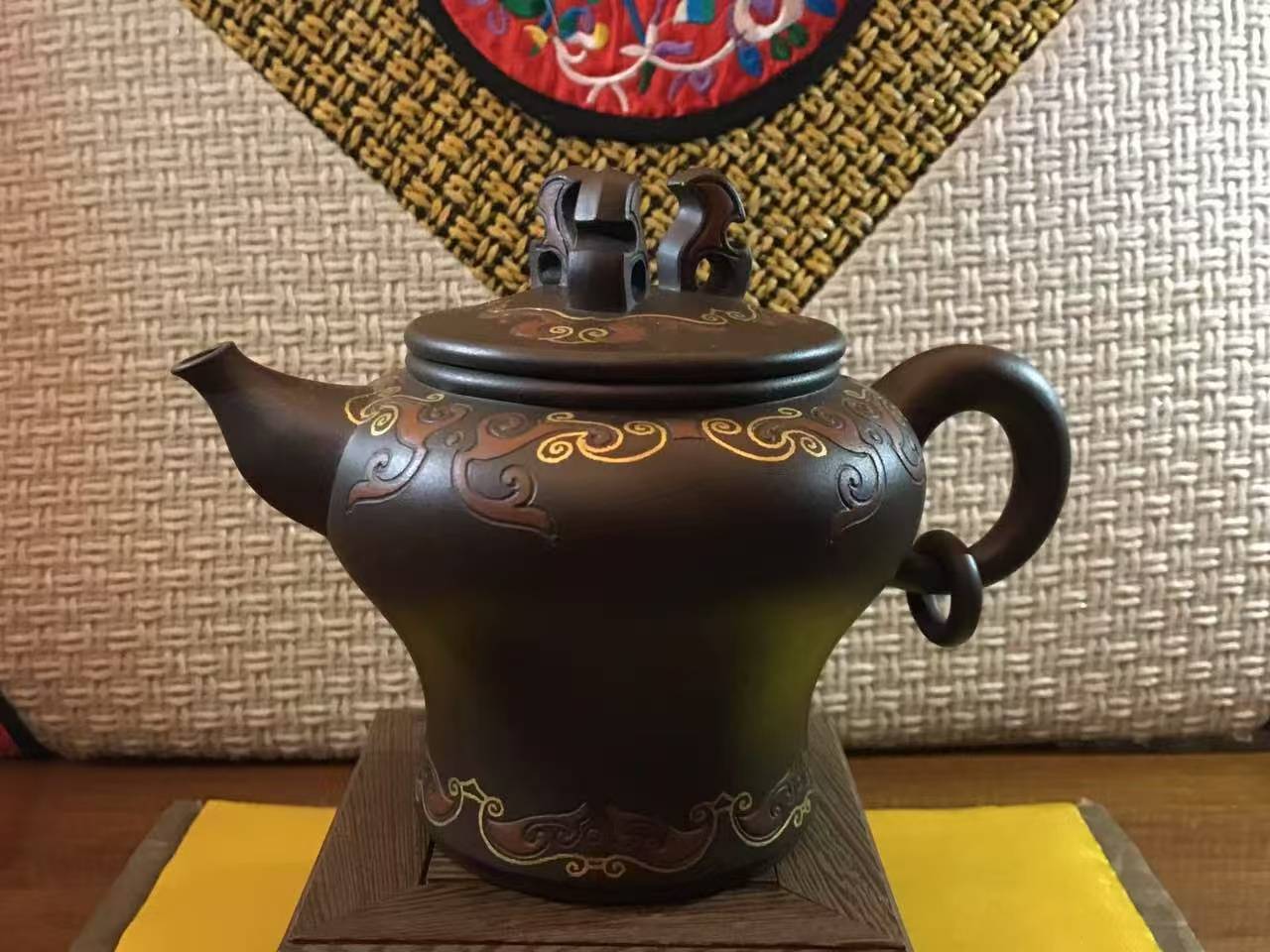 鲍仲梅的这件紫砂作品,在工艺上采用了金丝镶嵌等创新技法,这些技法不仅为这件紫砂壶的装饰带来了新的活力,独具特色,极具观赏和收藏价值。这件作品在色彩和纹理的处理上非常细腻,无论是金丝的镶嵌还是泥绘工艺,都达到了极高的艺术境界。