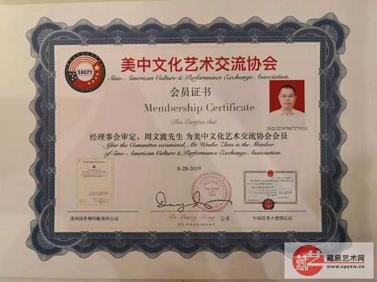 周文波先生的美中文化艺术交流协会会员证书