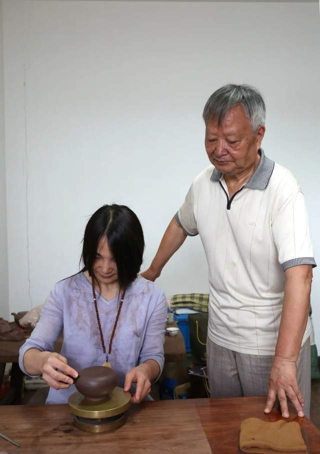 ▲周丽萍和师父倪顺生创作中