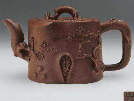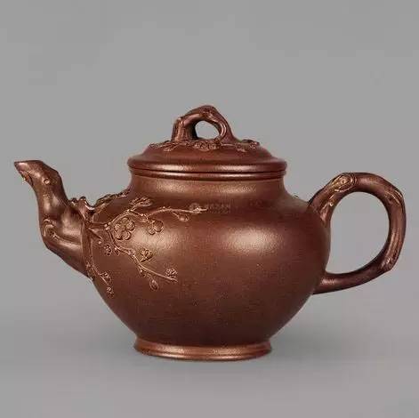 ▲ 段泥竹节壶 壶身由著名陶刻艺术家任淦庭刻朵朵梅花,另一侧刻“两腋生风,漱石作”底刻款为“自怡轩”