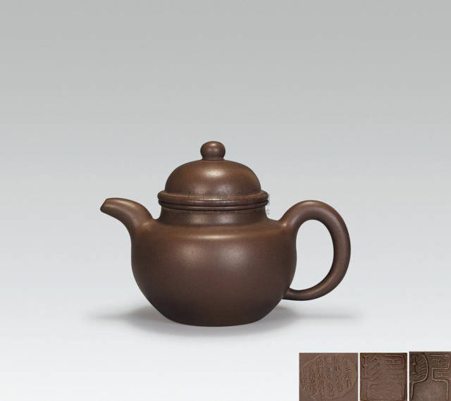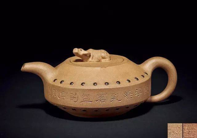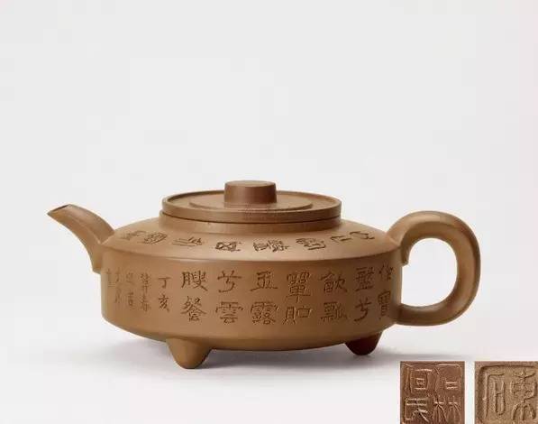 清嘉庆 杨彭年制、陈曼生刻 阿曼陀室款紫泥乳鼎壶,2016年12月于西泠印社以603.75万元成交。(西泠印社)