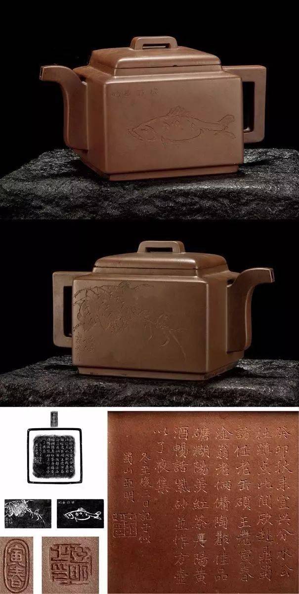 ▲ 紫泥亚明四方壶 镌刻:七十五老人缶硕铁笔。亚明出样并写鱼。寅春捏壶。秀棠刻鱼并底书。淦庭空刻。