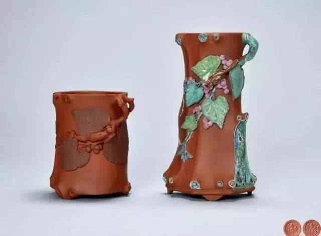▲杨凤年制加彩松树葡萄纹壁瓶、松树葡萄纹笔筒