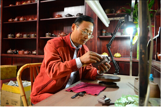 让紫砂壶变成有呼吸的生命 周胜平为人厚道,对艺术真诚、负责,如今他的定单已经排到了一年以后,而且收藏他的壶的大部分是老朋友,或者是老朋友带来的新朋友。无论是新老朋友,他都认真对待,绝不让他人或者徒弟代做。诚实赢得了好口碑,技艺带来了好生意。面对大家的厚爱,他感到最难过的是时间不够用。