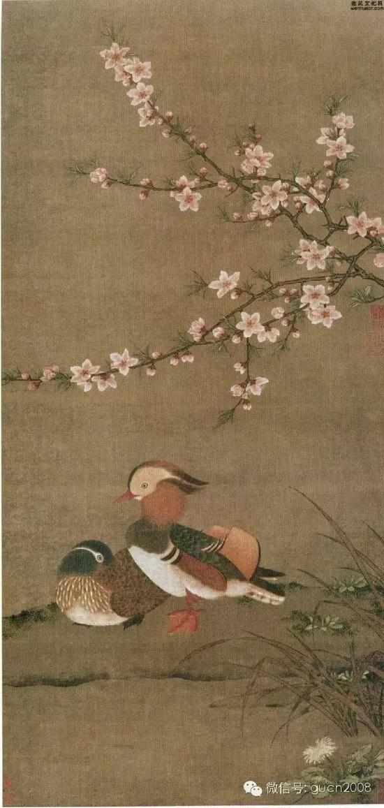 将宋代野逸、富贵两种主要的画法熔于一体了。水边野草以长线提劲双勾的率意为能事,敷色疏淡。桃树枝则以短线按劲双勾的顿挫、转折为特征,手法趋于工致。