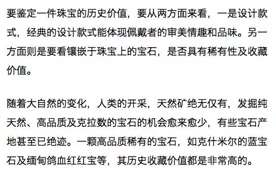 天然性和稀缺性珠宝迷们都知道,高级珠宝会因为具有特别的历史意义,或是被名人收藏过而提升价值,比如伊莉莎白泰勒的祖母绿珠宝,以及戴安娜王妃佩戴过的,现属于凯特王妃的蓝宝石戒指。