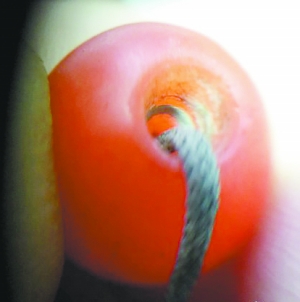 真 假 真 假 很多朋友知道石英岩染色能冒充翡翠、碧玉、青金石等。现在,石英岩染色冒充南红的都有了!大家提高警惕。 由于保山南红多裂,市面上所售保山南红玛瑙珠子多为磨砂面,这样能显得古朴并且也有遮裂的作用。这就为一些造假者提供了钻空子的机会——用石英岩进行染色,然后表面磨砂,仿冒完美品相保山南红玛瑙珠子。由于石英岩的密度、硬度与玛瑙相当,所以这样做出来的“保山南红”十分有迷惑性。 鉴别要点1 用强光手电打光观察 可见保山南红内部的墨点状结构,墨点颗粒极细、十分均匀而且整体通红。 染色石英岩则能看到因染色而内部炸裂成的网状结构,而且颗粒较粗,红色不够均匀。 鉴别要点2 观察孔道 石英岩质地相对细腻,结构较为紧密,制作成圆珠打孔比较容易,不易见棱角,甚至做出凹孔效果。 而玛瑙相对较脆,打孔后孔道截面棱角分明,甚至会出现崩裂,一般玛瑙的孔道是不会做出凹孔效果的。 另外,需要提醒的是,通常保山南红玛瑙由于属性等原因,多数会出现开裂的情况,所以,在见到无裂、整条十分匀称堪称完美品相且价格低廉的保山南红手串时,就该留神或及时找相关鉴定中心进行鉴定为好。 (李晓准/文 杨坤鹏/摄)