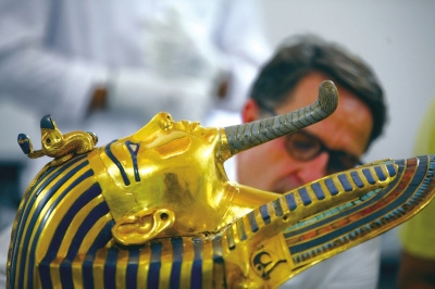 10月20日,在埃及开罗的埃及国家博物馆,德国专家克里斯蒂安·埃克曼在修复图坦卡蒙法老黄金面具。 图坦卡蒙法老黄金面具去年8月被埃及国家博物馆工作人员意外触碰,致使面具的胡须部分脱落。为了不影响展出,博物馆工作人员使用不当修复材料,在面具上留下黏合痕迹。目前,德国人克里斯蒂安·埃克曼带领德埃两国专家团队正在对此进行修复工作。 新华社发