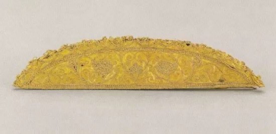 唐代女子常常会在发髻上插几把小梳作为装饰,唐代诗人元稹有诗云:“满头行小梳。”说的就是这种唐代女子的插梳之风。何家窖出土的一件精美的金梳背正是当时贵族家庭中的女子发饰,在《武媚娘传奇》中皇帝嫔妃的发髻上我们也能看到类似的梳背,但出土的这件文物显然要比电视剧里的道具要精致考究得多。在仅仅8厘米长,2厘米宽的梳背上,唐朝的工匠用细细的金丝掐成花纹,又用细小的金珠点缀其间,极为细密精巧,可以说是迄今已知保存最好、工艺最精的梳背之一。