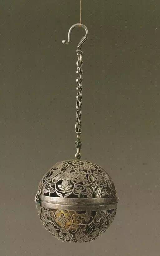 唐人对于金银的推崇,有时甚至会涉及一些我们意想不到的东西,比如香囊。我国古代女子有佩戴香囊的习俗,香囊多是用织物缝制的袋状物,用于盛放各种香料。而唐代上流贵族女子佩戴的是一种金属香囊,如何家村窖藏的葡萄花鸟纹银香囊,其外壁是一个银球,内层则放置则一个装香料的香盂,运用巧妙的重力设计,使得无论佩戴者如何晃动,香盂总能保持平衡,不至倾覆。其设计之科学巧妙,足以令今人叹绝。据《旧唐书·杨贵妃传》记载,玄宗在马嵬坡赐死杨贵妃后,将其就地安葬,待后来回到长安,念及旧情,秘密下令将杨贵妃改葬。当挖开坟茔时发现,杨贵妃“肌肤已坏,而香囊仍在”。想来杨贵妃所佩戴的应当就是这样的金属香囊。