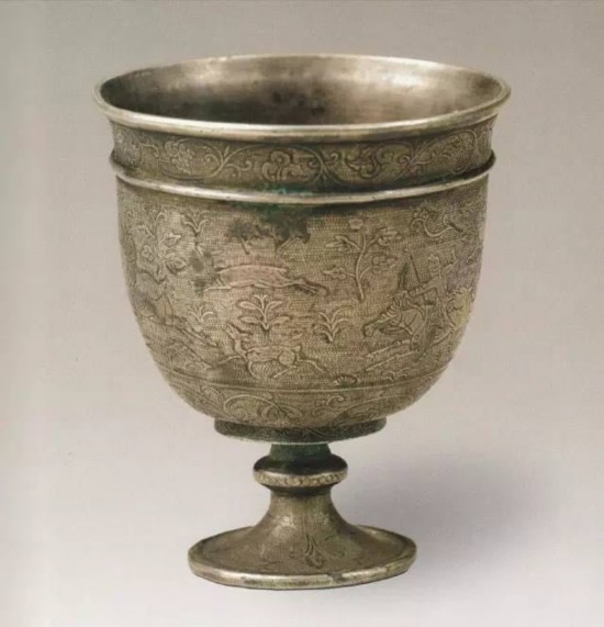 在出土的一个高足银杯上,描绘了两幅狩猎场景,一面是两个骑马者前后开弓,捕猎中间的野猪,另一面是一人在马上挟弓向后望,而后面的骑马者箭已离弦,射中前方一头小鹿,此鹿前方还有一头惊慌的鹿,以及一只奔逃的狐狸。四个英姿勃发的猎人正是当时的贵族男子,骑马射箭是他们主要的狩猎方式。“射”是儒家“六艺”之一,发展到唐代,成为了上到皇室贵族下到文士游侠的一种娱乐,尤其是骑马于苑囿、山林中驰骋、追逐,既可以一展豪情,又能舒活筋骨、聊慰雄心,一有所获,又可以举起这样的杯子,饮酒相庆,预祝下次狩猎的成功。