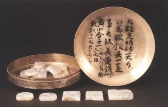 正因为生的多姿多彩和金光璀璨,所以达官贵胄们才格外惧死。于是,炼丹服药也成为唐朝朝野上下的另一种风尚。在唐代从皇帝到上层官僚都对这种追求长生不老的方式深信不疑,并且用金银这种福佑“不死”的材料制成贮药的罐子和盒子,煎药的锅、铛、铫,炼丹的石榴罐,以及服药用的杯、碗、壶等等。何家村窖的主人拥有全套的炼丹用具和大粒光明砂、光明碎红砂、朱砂、白英、金箔等名贵药物。据说这些药物都有镇静安神、益气明目、健五脏提精神的功用。从器皿上的墨书题记看,这时候炼丹用药已经使用“两”甚至“分”做计量单位,并且重视药物产地,知道区分药物质量的优劣,严格控制服药的剂量。不过依据现代科学,因为丹药中含有汞、铅等有害物质,无论如何服用,这些药物不会延长人的寿命,而只会加速服药者的死亡。这无疑是这些钟鸣鼎食者身上最大讽刺。