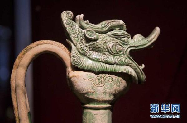2014年12月至2015年4月,加拿大多伦多阿迦汗博物馆(Aga Khan Museum)与新加坡合作推出《失去的独桅帆船:海上丝绸之路的发现》文物展,通过数百件来自约1200年前沉没的一艘阿拉伯商船上的中国唐朝“货”,为人们讲述了“隐没”已久的海上丝绸之路的一段故事。图为从“黑石号”沉船上打捞起的金碟 新华网 邹峥 摄 上个世纪90年代末,一位渔夫在印度尼西亚的勿里洞外海潜水捕捞海参时发现了一堆陶器。随后,一家德国打捞公司闻讯而来,在证实这是一艘沉没古船并命名为“黑石号”后,立即于1998年开始了持续近一年的打捞。数万件古代陶瓷制品及众多精美的金银器、铜镜等由此重见天日。 从“黑石号”沉船上打捞起的“勿里洞壶”(出水于印度尼西亚勿里洞岛海域),也称“白釉绿彩高足长柄壶”,其高逾1米,壶身刻有菱形带花叶纹样,或为河南巩县窑(约公元825-850年)所制。图为 “勿里洞壶”的顶部龙头特写。