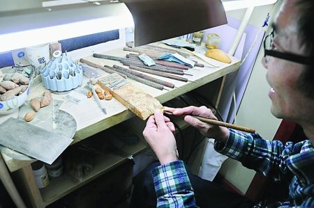 俗话说:“人巧莫如家什妙。”看一个人的手艺如何,只需观察一下他的工具便能知晓。在孙兴轶的工作台上,整齐地按照从大到小的顺序摆放着20余把不同大小 的刻刀。“一套刀基本要有15把以上,在进行不同方向的雕刻时,需要不同的刻刀。因为每一刀都必须精准合适,方才能做出上乘的核雕。”孙兴轶说。