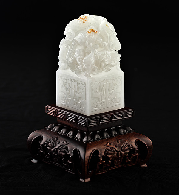 玉玺为古之重器,为皇帝正统合法之象征,以新疆和田子玉为质,取其材质缜密坚韧,寓意江山永固;取其色泽温润洁白,寓意正大光明。
