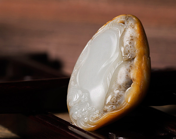 玉雕的创作在于表现玉料的精华,这款连年有余有着色泽漂亮的洒金皮色铺满整张荷叶;有着溅起的浪花晶莹剔透,直透心灵、清爽自然;有着素面的玉肉表现如绸缎般光泽的湖面;而最使人眼前一亮的是两条逼真写实的鲤鱼,“糟粕”变“精华”,是为创作者的独具匠心。