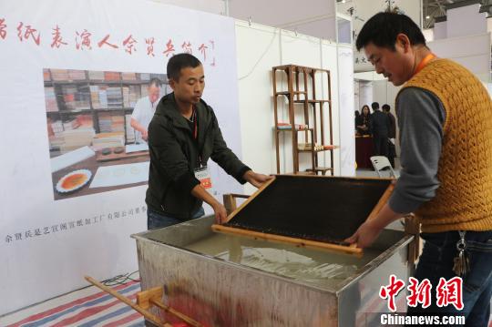 “文房四宝”展区内的“匠人”们现场展现捞纸技艺。 赵强 摄