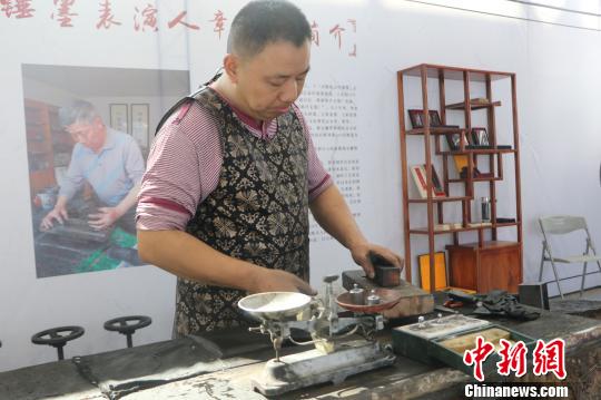 “文房四宝”展区内的“匠人”现场展现捶墨技艺。 赵强 摄