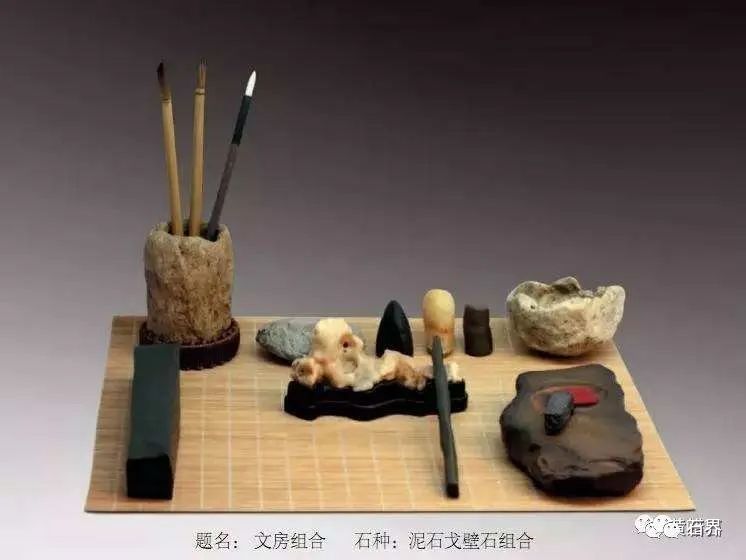 文房类赏石是文人赏石具有较高境界的收藏题材。文房系赏石以独特的神韵和风采,精美博深的艺术造型,承载着独特的文化内涵和历史价值,吸引了观赏石藏家的激情和遐想,并延续着千年文人的文化追求和现代人对于传统文化的敬仰和崇拜。通过画面石、造型石或者是小品组合的表现形式展现出文房用品,即笔、墨、纸、砚、笔格(笔架)、笔筒、镇纸、笔洗、水盂、水滴、印章、搁臂等。
