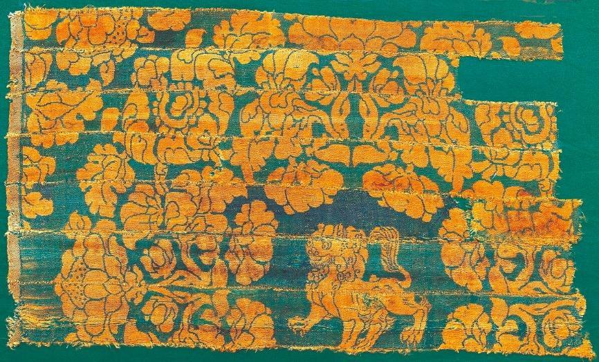 这种外围是花,中间是瑞兽的图案,在当时有一个特殊的称号——陵阳公样。陵阳公样在历史上留下的资料不多,许多人对陵阳公样的真正解释和存在都有疑点,但立狮宝花纹锦的出现,给了人们许多提示。