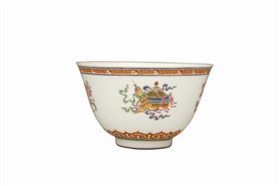 图3为粉彩八吉祥纹碗。碗高6.4厘米,口径10.6厘米,足径4.2厘米;敞口,深腹,下腹渐收,圈足。口沿下绘回纹,腹部绘八宝纹近足部绘如意纹。