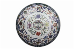 图2为白地五彩八吉祥花卉纹盘。盘高8.7厘米,口径51厘米,足径31厘米,敞口,浅腹,浅圈足;盘内壁腹部绘八宝纹,内底心青花双圈,圈内绘双凤纹间以缠枝莲纹,外壁绘缠枝莲纹。