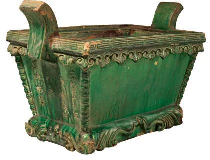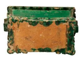 香炉大体呈长方形,上宽下窄。高20厘米、口长33.6厘米、口宽20厘米,底长21.9厘米、底宽12.4厘米。炉口两短边装饰双鼎耳。外口沿深刻一周连续回纹。回纹口沿下又接一周镂刻外翘的如意云头纹。炉四边棱呈凸出的竹节状。竹节棱下部各有一兽头,兽头两侧刻划毛发并与相邻的兽头饰连为一体,成为底边的外层。边棱内层为素面。炉外侧及内口沿施绿釉,其余部分不施釉。炉胎较粗,有明显的沙粒,底部呈火石红色。炉侧面题写“万历十七年仲秋吉日成造德府施捨”。