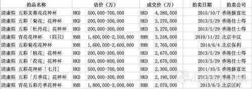 据了解,1996年,天津文物拍卖公司的春季拍卖会上,曾出现过一套十二月花神杯,估价仅几万元,经过几轮激烈竞价,以将近200万元人民币成交,这在当时已属天价,那个时候成交价超五十万的书画、瓷器已经是非常珍贵了,现在拿出来都是上千万的重器。同年,香港苏富比曾上拍过一套“清康熙 五彩十二月花神杯”,仅估价就达450-550万港币,最终流标。