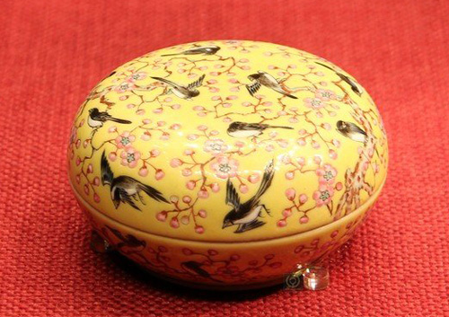 黄地粉彩喜鹊梅花纹粉盒
